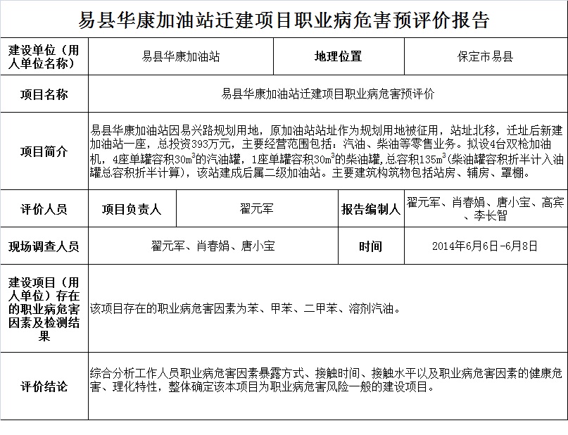 易县华康加油站迁建项目职业病危害预评价